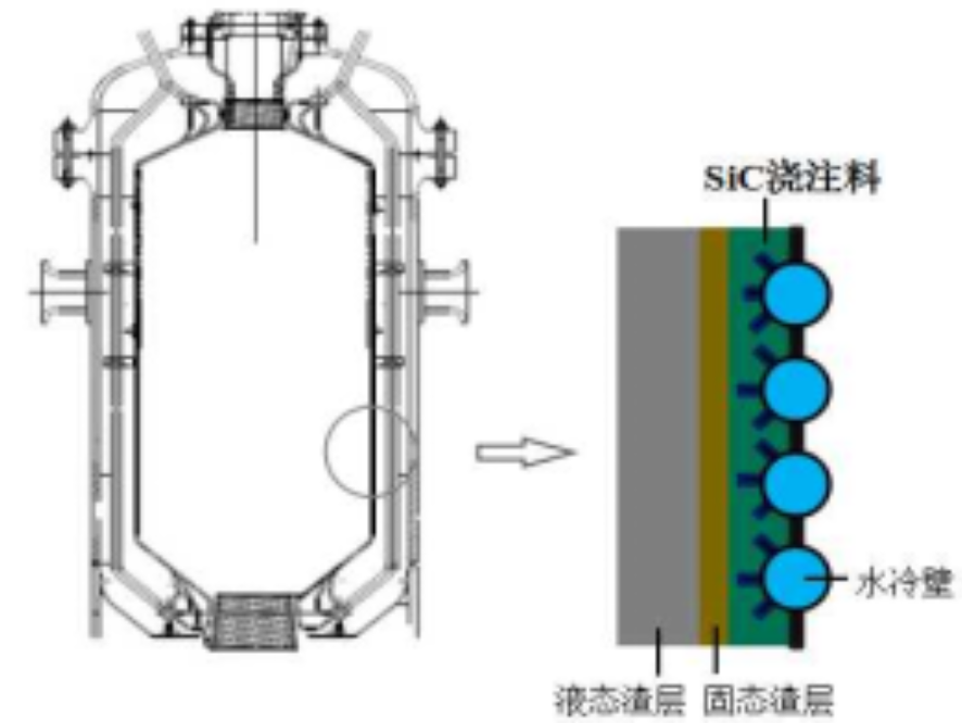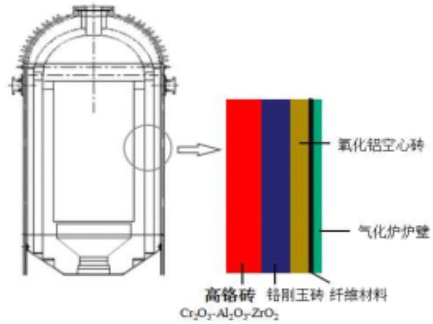 气化炉是高温高压煤气化反应的场所。气化炉钢壳耐高压但无法承受超过350℃左右的高温,而气化炉内操作温度常超过1200℃,气化炉钢壳内设置的隔热衬里需要隔离高温气体传导过来的热量,还需要耐受高温熔渣颗粒的冲刷和侵蚀。