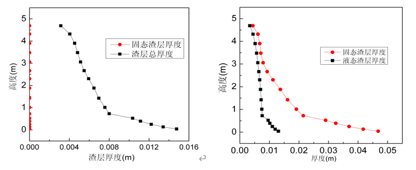 图1 渣层厚度随高度变化(左:耐火砖气化炉;右:水冷壁气化炉)