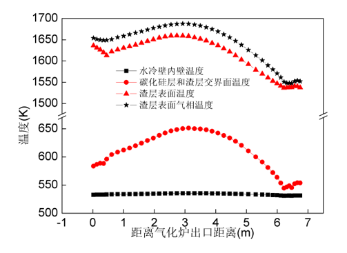 此外,水冷壁炉炉壁热阻(图2虚线框内部分)远小于耐火砖炉,水冷壁炉内从工质水侧到碳化硅内表面的温升小于耐火砖炉金属壁面到耐火砖层内表面的温升,碳化硅表层温度远低于灰渣熔融温度(只有约380℃,见图3),有利于固态渣层的形成,起到“以渣抗渣”的作用。而耐火砖表面温度高于熔融温度,从而无法形成固态渣层,耐火砖处于较高的工作温度,直接受液态渣层的冲刷和侵蚀,使用寿命受到较大影响。