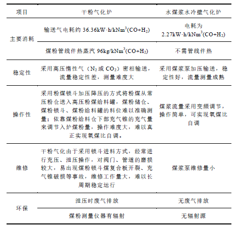 水煤浆水冷壁气化炉与干粉气化炉的原料加压和输送系统对比如表1所示。